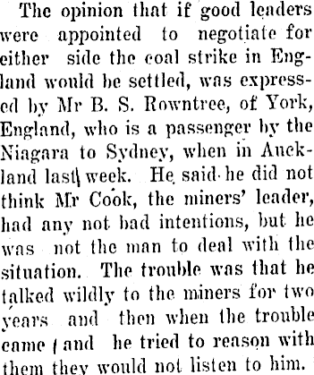 The opinion that if good leaders were appointed to negotiate for either side the coal strike in England would he settled, was expressed by Mr B. S. Rowntree, of York, England, who is a passenger hv the Niagara to Sydney, when in Auckland last\week. He said-he did not think Mr Cook, the miners’ leader, had any not- had intentions, but he was not the man to deal with the situation. The trouble was that he talked wildly to the miners for two years and then when the trouble came | and lie tried to reason with them they would not listen to him.