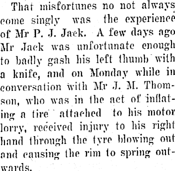 That misfortunes no not always come singly was the experience of Mr P. J. Jack. A few days ago Mr Jack was unfortunate enough to badly gash his left thumb with a knife, and on Monday while in conversation ivitli Mr J. M. Thomson, who was in the act of inflating- a tire attached to his motor lorry, received injury to liis right hand through the tyre blowing out and causing the rim to spring outwards.