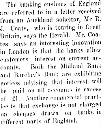 The hanking customs of England arc referred to in a letter received from, an Auckland solicitor, Mr R. J. Coats, who is touring in Great Britain, says the Herald. Mr. Coates says an interesting innovation in London is that the banks allow customers interest on current accounts. Both the Midland Bank nud Barclay's Bank are exhibiting notices advising that interest will ho paid on all accounts in excess of £l. Another commercial practice is that exchange is not charged on cheques drawn on hanks in different parts of England.