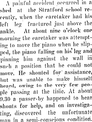 A painful accident occurred in a shed at the SI rat ford school recently, when the caretaker had his left leg fractured just above the ankle. At about nine o’clock one morning the caretaker was attempting to move the piano when lie slipped, the piano falling on his leg and pinning him against the wall in such a position that he could not move. He shouted for assistance, but was unable to make himself, heard, owin'? to tbe very few people passing at the lime. At about 9.30 a passer-by happened to hear shouts for help, and on investigating, discovered the unfortunate man in a semi-conscious condition.