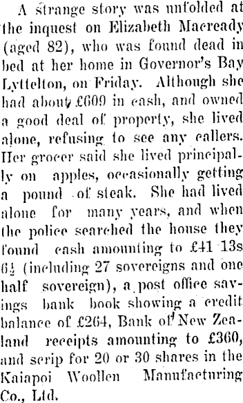 A strange story was unfolded at the inquest on Elizabeth Maeready (aged 82), who was found dead in bed at her home in Governor’s Bay Lyttelton, on Friday. Although she had abouV£fio9 in cash, and owned a good deal of property, she lived alone, refusing to see any callers. Her grocer said she lived principally on apples, occasionally getting a pound of steak. She had lived alone for many years, and when the police searched the house they found cash amounting to £4l 13s (j> (including 27 sovereigns and one half sovereign), a.post office savings hank book showing a credit balance of £2(54, Bank of* New Zealand receipts amounting to £3(50, and scrip for 20 or 30 shares in the Kaiapoi Woollen Manufacturing Co., Ltd.