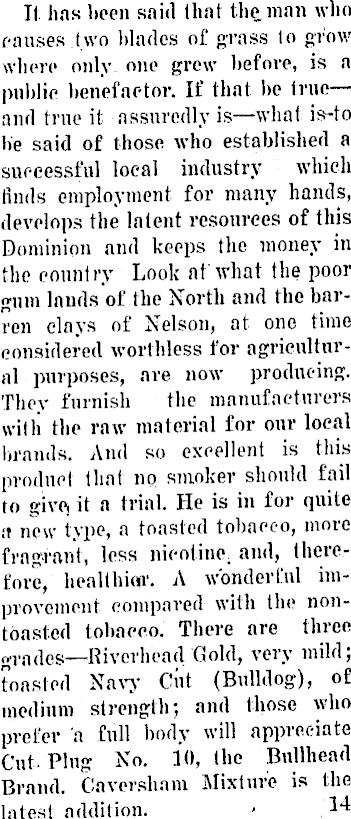It has been said that the man who causes two blades of grass to grow where only one grew lief ore, is a public benefactor. If that lie true—and true it assuredly is—what is-to be said of those who established a successful loeal industry which finds employment for many hands, develops the latent resources of this Dominion and keeps the money in the country Look at what the poor gum lands of the North and the barren clays of Nelson, at one time considered worthless for agricultural purposes, are now producing. They furnish the manufacturers with the raw material for our loeal brands. And so excellent is this product that no smoker should fail to give, it a trial. He is in for quite a new type, a toasted tobacco, more fragrant, less nicotine, and, therefore, healthim'. A wonderful improvement compared with the noiltoasted tobacco. There are three grades —Riverhead Gold, very mild; toasted Navy Cut (Bulldog), of medium strength; and those who prefer a Cull body will appreciate Cut. Ping No. 30, the Bullhead Brand. Caversham Mixture is the latest addition. *