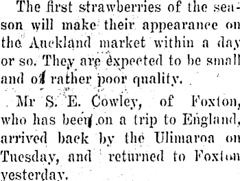 The first strawberries of the season will make their appearance on the Auckland market within a day or so. They are bxpeeted to lie small and oif rather poor quality. Mr S. E. Cowley, of Foxton, who has a trip to England, arrived back by the Ulimaroa on Tuesday, and returned to Foxlun yesterday.