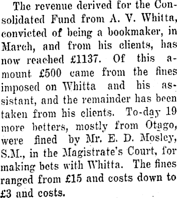 The revenue derived for the Consolidated Fund from A. V. Whitta, convicted of being a bookmaker, in March, and from his clients, has now reached £1137. Of this amount £SOO came from the fines imposed on Whitta and his assistant, and the remainder has been taken from his clients. To-day 19 more betters, mostly from Otago, were fined by Mr. E. D. Mosley, S.M., in the Magistrate’s Court, for making bets with Whitta. The fines ranged from £ls and costs down to £3 and costs.