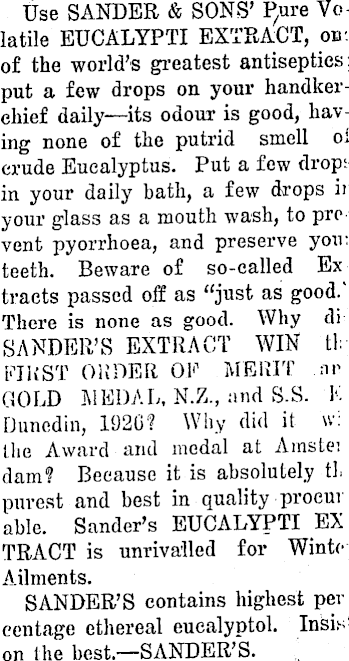 Use SANDER & SONS’ P/ire Volatile EUCALYPTI EXTRACT, on: of the world’s greatest antiseptics; put a few drops on your handkerchief daily —its odour is good, having none of the putrid smell o! crude Eucalyptus. Put a few drops in your daily bath, a few drops in your glass as a mouth wash, to pre - vent pyorrhoea, and preserve your teeth. Beware of so-called Ex tracts passed off as “just as good.' There is none as good. Why di SANDER’S EXTRACT WIN tl, FIRST ORDER OF MERIT nr GOLD MEDAL. N.Z., and S.S. E Dunedin, 1920? Why did it w the Award and medal at Amstei dam? Because it is absolutely tl. purest and best in quality proeuv able. Sander’s EUCALYPTI EX TRACT is unrivalled for Wintc Ailments. SANDER’S contains highest percentage ethereal eucalyptol. Insis ! on the best. —SANDER’S.