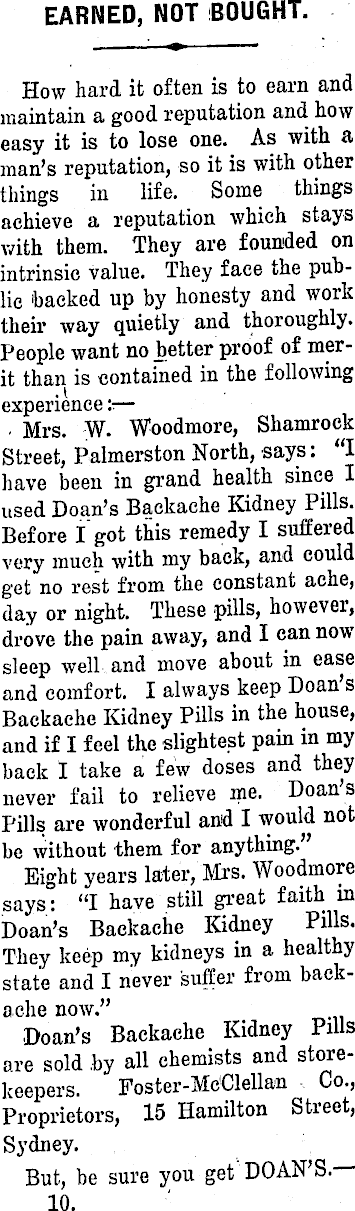EARNED, NOT BOUGHT. How hard it often is to earn and maintain a good reputation and how easy it is to lose one. As with a man’s reputation, so it is with other things in life. Some things achieve a reputation which stays with them. They are founded on intrinsic value. They face the public backed up by honesty and work their way quietly and thoroughly. People want no better proof of merit than is contained in the following .1 experience :■ — Mrs. W. Woodmore, Shamrock Street, Palmerston North, says: “I have been in grand health since I used Doan’s Backache Kidney Pills. Before I got this remedy I suffered very much with my back, and could get no rest from the constant ache, day or night. These pills, however, drove the pain away, and I can now sleep well and move about in ease and comfort. I always keep Doan s Backache Kidney Pills in the house, and if I feel the slightest pain in my back I take a few doses and they never fail to relieve me. Doan s Pills are wonderful and I would not be without them for anything.” Eight years later, Mrs. Woodmore says: “I have still great faith in Doan’s Backache Kidney Pills. They keep my kidneys in a healthy state and I never suffer from backache now.” Doan’s Backache Kidney Pills are sold by all chemists and storekeepers. Foster-McClellan Co., Proprietors, 15 Hamilton Street, Sydney. But, be sure you get DOAN’S.— 10.