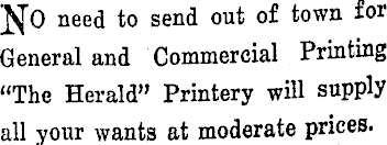 $0 need to send out of town for General and Commercial Printing “The Herald” Printery will supply all your wants at moderate prices.