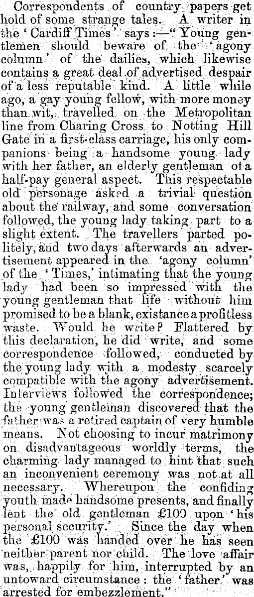 Correspondents of country, papers get hold of some strange tales. A writer in the:' Cardiff Times'-''says Young gentlemen should beware of the : '.agony column' of the dailies, which likewise contains a great deal .of advertised despair of a less reputable kind. A little while ago, a gay young fellow, with more money than,wit,; .travelled on the Metropolitan line from Charing Cross to Notting Hill G-ate in a first-class carriage, his only companions- being a handsome young lady with her father, an elderly gentleman ot a half-pay general aspect. This respectable old personage asked a trivial question about the' rail way, and some conversation followed, the young lady taking, part to a slight extent. The travellers' parted politely, aud two days afterwards an advertisement appeared in the. 'agony column' i of the ' Times,' intimating that the young i lady had been so impressed with the ! young gentleman that life without him I promised to be a blank, existaneeaprofifciess I waste. Would he write ? Flattered by this declaration, he did write, and some correspondence followed, conducted by the young la dy. with a modesty. scarcely compatible with the agony advertisement. | Interviews followed the correspondence; I the young gentleman discovered that the [ father was a .retired captain of very humble means. Not choosing to incur matrimony on disadvantageous worldly terms, the charming lady managed to hint that such an inconvenient ceremony was not.at all necessary. Whereupon the confiding youth iriade handsome presents, and finally lent the old gentleman £IOO upon 'his personal security.' Since the day when j the £IOO was handed over he has seen | neither parent nor child. The love -affair was,, happily for him, interrupted by an I untoward circumstance : the 'father* was i arrested for embezzlement."