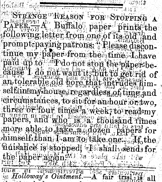 -Keason for Stopping a Buffalo' paper prints-the following, letter from i'ts t blfrVand r prompt r paying patrons:" Pleasfdiscontimie my paper jfrom the/ .time' i.Jiave paid Ap to" ,r T'do-jwt stop the jpape'r-ibe-caiisfe I s^lft u§.e« regar ellesg ~os tin^r^nd } to^siufor'anrhour oi^wo, tirnigsV w'eek'/ to' papers,""an'd is, &£ thousand fimes cffiorp for J^thei ia^o^ped| ■ Vfo''-i :: •••': im«_- m ' ■s£; JloLloway s Ointment.—A. fair trial j'iij all