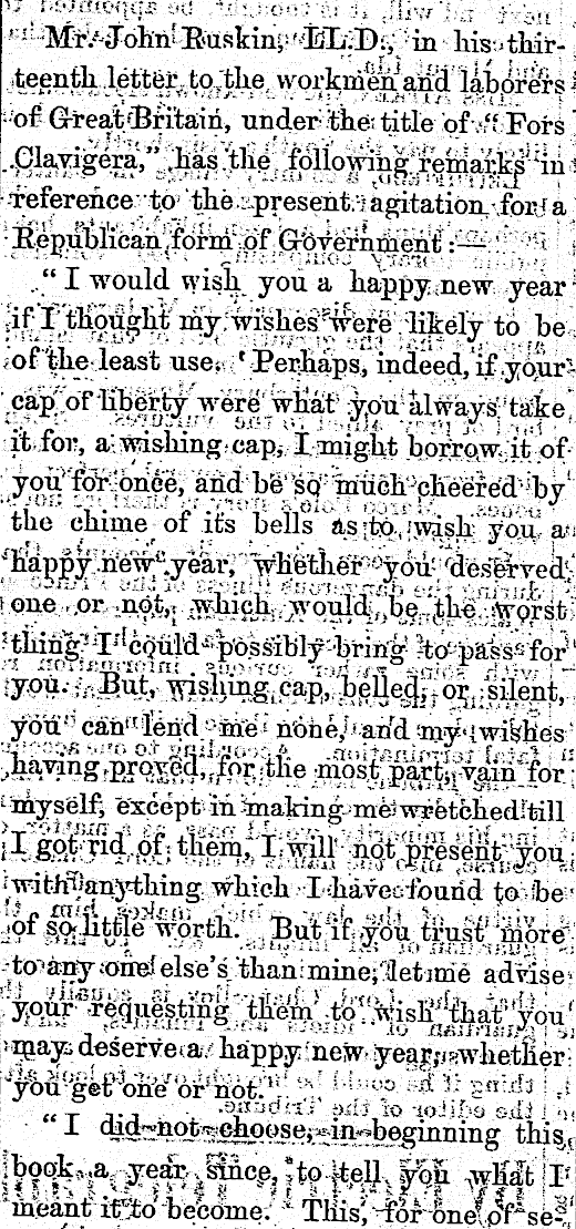 '-Mr.*-John' BuskingELll):, in liis .thiritegntli letter, toJtlievvorknienaiid laborers i •of Great Britain, under-/the; title ofv" Pors ..piayigera," t has jtlie. fpliowing.'temai^^ii.l •reference t.o'' the agitation.- for f a Be publican. form' pf Government' ' 1 • X would wish you a happy : new year' ; if mjr; likely to be ,'of 'the- least uses- r Perhaps',*indeed, if .yojir"~ cap oF liberty werewKat .you always ta;ke~ it.for, a-, wishing? cap i; X -might borrQw ; it ofand i bfe' > sQ' ; iriu the chime ■of it's bells as|to. ( ;>\dsh; you a«i "happy whfetlier-you' 'deserved' -» « *' • a .£ " ' v I - I, ■ ' - ' tone -.or .no ( t,. which jvvould fl bj? \the -Vrorst ■ tMng?-]! 1 { r CQu}d^possibly -bring ?to^'pas for 51 :you.But; cap, beUeJl'or .silent, you'" can 1 r lend me 1 none/ < and 'my«iwikhes *, :« «> or ' a .ivr-ip-ff * 1: ■having .proved,,for the most for -myself, "except in -making-mei wretcheditill 11 gofnd, .of them; I ndt present; • which I havetiburid to fee - iOi s # Of4itfc|e worth.... But ifi-grou trust' more : to<anyionef else's than;mine; ietjme adVise* ' tliem tb f 'WisK%aT' , you i iipay, deserve, a happy new "you'get'one or not. 1 ' \ \° t c j. f."I ; -KlO yq 'lO " s £(li ! < " I choose, this, f .book,,a year "to |tel), |rou I : meant itfjfco become. * THis/ r f6r" w bnef^f i se?'