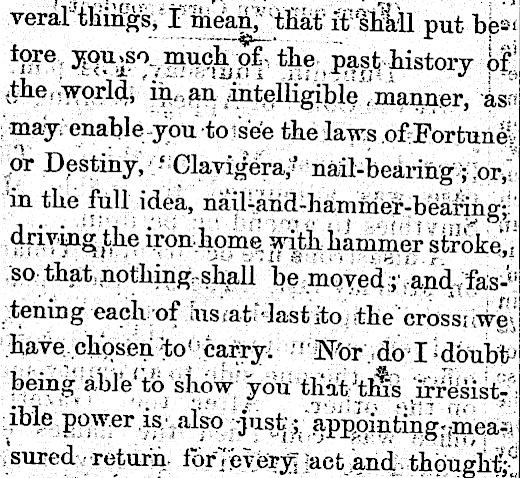 veral'things v I iheaiif tE&t' it u shkil put ty»< tore, muct pf. the past history b£ .the. worlds in,, an intelligible .manner, "as>"' may. enable you to see the laws of Fortune,P r Destiny, Clavigera, 1 ' nail-bearing ; 'in the full idea, nail-aiid-hammer-bearing; driving theironlipme with hammer stroke,so that nothing shall be moved;''and.."fas- si tening each of aistatt'last ito • the cross; '.we 1 , have chosen : to' carry. "N'or.dol ; doubt' able r to "show you ttiat/tlife ible power is' also -just; app ; qinting- i: mea-> sured return forTevery acfc and thought^;