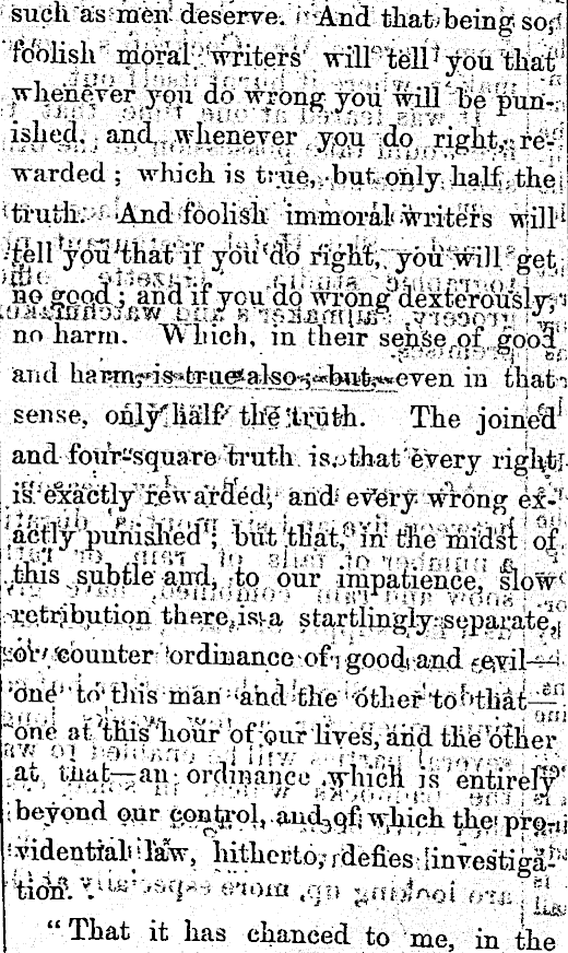 such "as men'deserve. > ; And that, being sos' : ' foolish" inorar.-writers' wilFtelPyou that 1 ' whenever you' do wrong you' will' be' pun-, isliecl. i and.,,whenever . yo;u. "do. right,♦: re--warded ; which is trae,i-£ufc*>Bly; hajfvthei : truth: -And foolish immoral'writers Will' -^ll ; you^that'if HOgood'- 'and if you/fro wrong o deiterouily; "J no harm. Wluch, m their sep£e f pf, l .goo3 v aiid haranH in thatn sense, only'lialf' tlie 'truth. The joined and four-squaretruth is.othat'every is. ; exactly rewarded',* and' eiferj wrong ei- n but jtHa't, 8 m ; tlie = of , v ®s c ? sub£le a,url, ?to_ oiir impatience,' slow* thfire } iss-a startlingiyrseparate,)' tebunter- 'ordinance >o£i goodt and f 'of ;oux lives', aiid th&tfther sflfc %a ; t—anj ordnance' is ' entirely 15 ■ beyond our evidential)ilaw, hitherto; rdefies linvestip^ • a ti(M.*i t/ioia . f ; . **" > Lm That it has chanced to me, in the