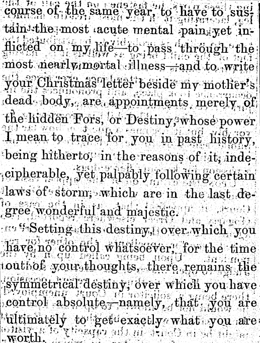 cojarse of- ; 'ilie same' Vear/'/io' Have to ,'susi tain'3-tlie ; :-most tacute mental -paintyet injfliptftd on ; my,life'^-to^pass,!'through^'the; most f nearl\simfi>rital .■ illness-ptand 'ypur"'lGhn^mks4et:£Sr,'beside-;my-idead ? ;bo.dy,', are, appointments, merely^ s pfi the hidden Pors, or Destiny, 3 whosempower •X i mean, to trapes 'for, you in past Instory, being hitherto*," in'the reasons of' it ; inde■iCipherajbl t e, 4 yet, palpably r fbllbwihg' 'certain -laws 1 sfeornii »;which are in the last. d'e(greeVwonderfulJand majestic. J 1 ■ :it 'f "tS etting i ;this» destiny,! a over, .which T.you control the time roufch.bS yoiir.,thoughts, ..ther'e; li remainsr ;jsy^mmetricarr'destinyf r over which you have !.control .absolute—namely, >thSfcV you are ! ultim'at«ly to ! ' exactly^what«>you lalre • . \vorth. : r „..
