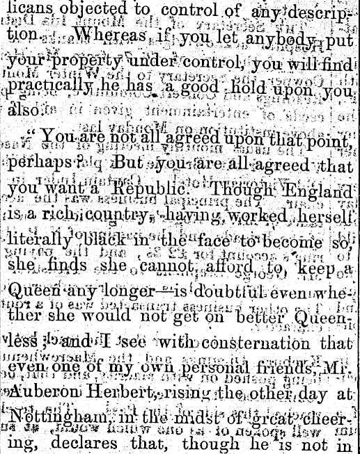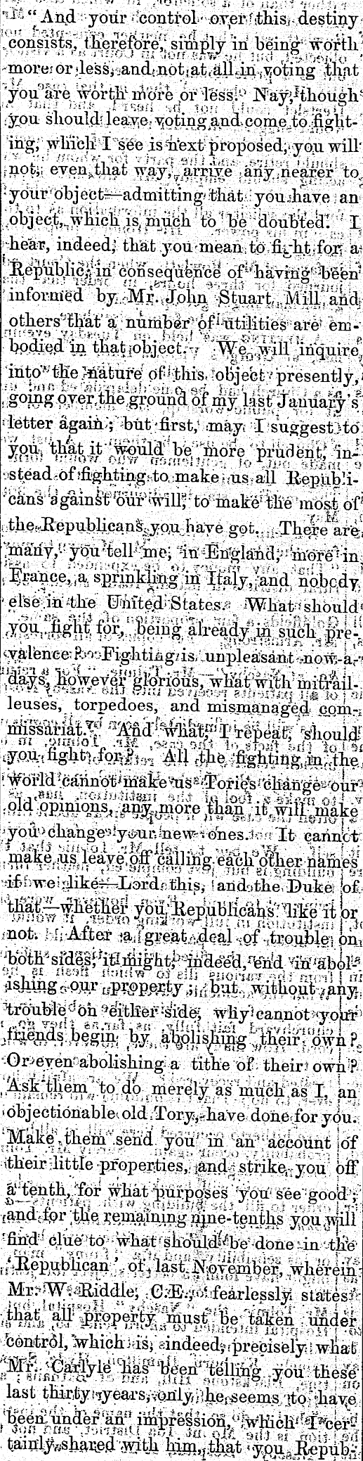 % x,« And ■ your ■ icontroL - sourer;' ithis * vdestiny ■ consists, therefore',' simply in being" worth, -mores or ile'ss, 1 iandtnotjat, iliat you'are or 'less; l ' Nayjithough - ■you should; tb.figliting, >vhTch I see is n'ext proposed;-you will' not,, even >, that way, y arrive . any nearer to ; jrour : object—admitting/ that-, you Jiave = an , object,..which is] muqh' to ' b'e : doub"{ecll ' I hear, indeed," that you-mean to fitjht acon seq'u&n'ce ofhavinig-%'ejen ? informed by Mr" John Stuart iW ill', and others' J "that' a' number' of l utilities are' em- , , ~ f V *.j V-»-f • t f j* . j 4 . 'v f f 4 s n in thatiobjeeLxr n ,jWill 'inquire, into Ij the Mature of'this. -object ' presently,' i g°lfig pyer,tjie'ground of my Vstf January's' : letter agaifi/; but *first,\ may* -I suggest >to y e ssii ]?£, 1 uiore "priid entj ini • stead -of?fi>ghting:to, make.';us-all EeplibUcan's a gain fc't 'our' •will^" to make 1 the 'most of , epublican'^you h aye go fc... .Thei?e ar&; maiiyy-' y^u'tell'ine; -in' -England,- in, , Erapce, ,a sprmkling ih Italy, Jand nobc'dy.' ' else .in -the Fmte,d : States.. should* &eipg, such pre-. vyalenee: is. .unpleasant --noTR-a,-"? ",%ys! v v«*ii \.jni ;,' v . j }'■. 7 p ' A .g, • *\ t leuses, torpedoes, and mismanaged cqm.-j j: Md"^wlat« ; I tepeafc; hghk'foclJJ "j£ll rthe f 'figiititig I; ,m;ihe ' WoM-caiin make nis s -Tori(fs <'%an£e'-'our' J "W'j (8 3 v; S )-l J f "•> T O'! tj* l ft V* ff '* * ' v *" •<?f4 opinions^_ jany .more iharirit^wiir'make ; ~ '' U- S' - - liviJO j *- ;/ou'> ones, h- - 'lt carintt j 1 ipfe nk'me s if' - we : JikefWLord? this,- 'ancbthe IDuke. bf lor•not. : [;-After ja.f great-.deal -.of pni ;both' J si'd'e.'sf J "ifl ifii^htf 5 -leiid v ih' -.' rs-.'jrj ['li Mvi en c.h P i'H, : f. 5 n~; : is .hing pour f ?p?operty ; /. but., without /'any, 'troubl ebn ?e f itlier : : sidei why i cannot^yoifl? f jfiie^ids,begin; b.y abolishing-a tithe of; their? own.'? ~4;Sk( it h^ma j as much as I, an 'objectionable-old done for you. . ■M'&ke; ? them .send , you' in an' account |of 'their little properties, 3 and; strike,, you off whafpurpqses you 1 see good ;- j§P.d { fpr e,maining njne-tenths yoji 'find" clue to' what' done -in -tlfe' > >• Qtj wherein.' Mrr|Wv[Riddle; . C:E.j r fearlessly! sta ! tes3 5 -" ,44' • under control, which -indeedy rprecisely: wliab rM" .you 'these; last thirty <iyears,,oniy f - J he<-seems impression/ 'jwhich-'^cbr^ ' . v» * i r , J ./1 ~Jt)\ l, ( r•? i • vl £j[ i x"* 11 1 rj f i if'" "t tainly fi shaiied ''With