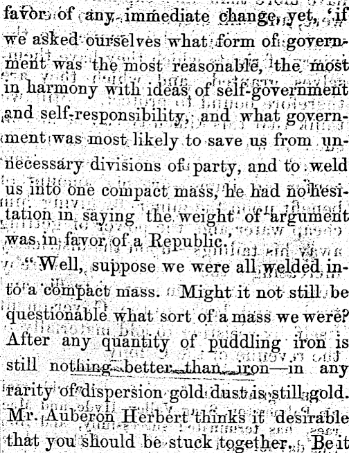 iayopjjbf cstny^immediate ghang§ )7 yet,; we , merifr was 1 the" m ost reasonable, ,in harmony with ideas; of'self-goVemmeiTt sud self T <pna • what'gQypriv*" <ment! was most likely to save us from ijiifriecessary divisions ofu party, and to; weld US itito one compact mass,-'hie liad noOfesi(t.aiion. tliaweight 1 ' was, in*favor, of a Republic.'- ' *\ ? 7.' * tit" si r - >-yu!j«nj j»rr. yj-.v.i: J ' "Well,, suppose we were all,gelded into® a c'om'pact mass. ; Might. it not- still.be ' questionable 5 what sort of -a mass we were? After any'quantify of puddling iron is still not^mg^bettei%«^haiwico'n—in any •'rarity 'crfhlispersion- gold< dus.tr <is; ;stillngold. «jf* f Aiiberon Herbert if "defeirable •that you 'should : be 'Stuck itp,g€ther.,.J3 'B J e;it
