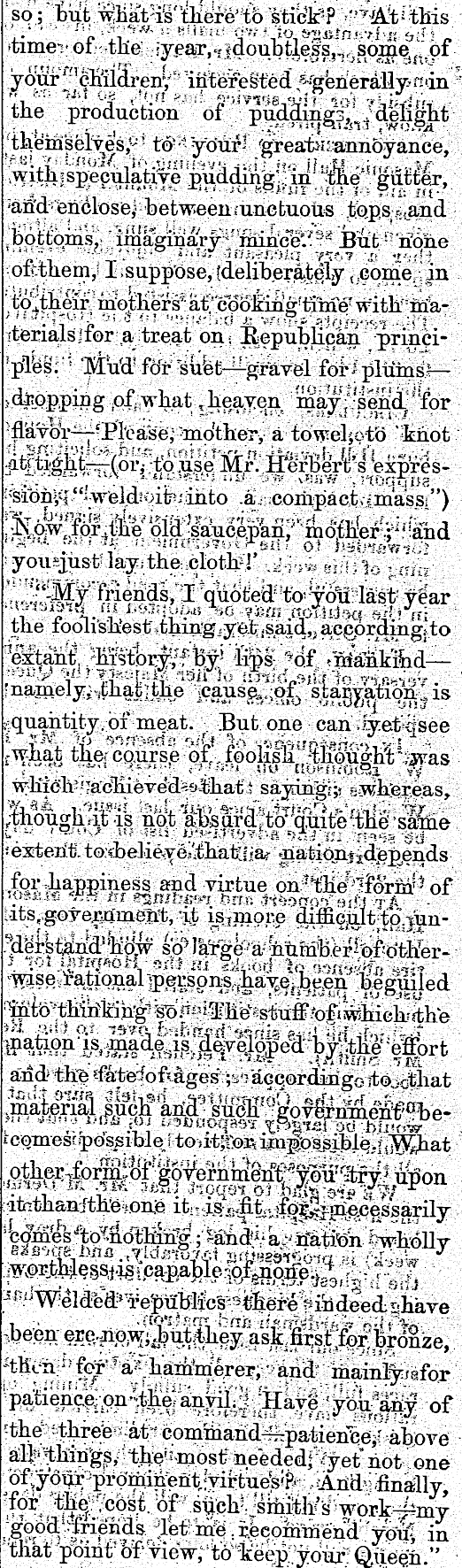 so; but wßat'is'tliefe'tb stick'-? "~ r At : this -time--of the , ; y <?ar, ■>»doubtie£s~ o som§ r .of , yotir^ 1 children; "' interested the production of 'themselves,'' to'•'your- 'greats.'annoyance, with-speculative pudding'Jin' : 'lhe tf gutter, ■and enclose, 3 between .unctuous tops *,_ and t bottoms, imaginary \ mince'/ - * But' "none oft them, I .suppose, (deliberately, come in mothers'at Vdokihg tinfe'with materials'for a treat on, Republican principles. 'M'u'd'fdr sufet—gravel for/plums ! — dropping ,of, what , heaven may ; send/'for flavbr^-p'Pl'ca"sej another, a towel joto knot dtjtight—(or, to use Mr. Herbert's 'expres- ' : sionvn '\weld=oifr;into .a, .compacts ''mass/') | oid saucepan,'' mother'.; * i: and lay,the cloth-!' , ' "..;"-My"friends, I quoted toyoii last' y£ar the fooli'sh'est .thin'g : yet .said,, according!to ' extant history,'' r By' lips 'of >nianki?nd—- , 'namely,-.thai;.the" .caus'fe.Vf'''scanya^ion r , is * .. "Jt>7 ; .quantity, of meat. r But one canJyetqsee rwh'at the? course o£„ foolilli' \-jras ! whiclv^acHieved'-y-that 4 saying,-;; ijwh'ereas, , plough .-it is not absard' ! to r quitfe' r tlle' sline v»* fV " ; --2 .;,j ' s exterit. to'^beli&ye '.thatj'iar pation* x d<3pjmds for happiness and virtue on'the'^form''of 1 " - l i tJ -u T A .-its govefriment, it i_s ? more difficgJtYp.jym~<l^r'stand!'iiow sV large a Tpse National 'persons ,-ha^e ? been beguiled 1 into thiiikin , g'|"o:"i ! JThe v stuff < ofiwhich Ifche and the *fate'?o£ages j ;to„ctliat , .matjerial Aucli ans. } stiSli^'gov^inmefif^ei comesr possible. toiitji'or, lmp.t) s gible .f ,^iQiat other.formio|'-go^ i ■itathanlth'e jonje is^fit.vjfo^jaiftcessarily . : 'ctfm f es j: to v .noT:l4n , g; Wholly .w,orj>hile§s,j.^ 1 ? ' J ri -Welded* shave been ere now, Jut they ask 'fisst.for trdnze, -then r for*'a' ham'mereT, • and mainly^for patience on-the anvil./ Have'you any of -the "three at' above all "things, the': most needed; yet not one 6f;your ; promnent/yiftues : ?' . And- finally, "for '. cost. of that point bf' view, to keep, your Q.ueien."