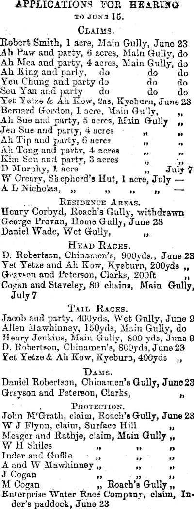 APPLICATIONS FOE HEARING TO JUK3 15. Claims. Robert Smith, 1 acre, Main Gully, June 23 .Ah Paw and party, 6 acres, Main Gully, do Ah Mea and party, 4 acres, Main Gully, do Ah lung and party, do do do Yeu Chung and party do do do Seu Yan and party do do do Yet Yetze & Ah How, 2as, Hyeburn, June 23 Bernard Gordon, 1 acre, "Viain Gu'ly, „ Ah Sue and party, 5 acres, Main Gully „ Jea Sue and party, 4 acres • „ h Ah Tip and party, G acres „ „ All Tong and partv, 4 acres „ „ Kim Sou and party, 3 acres „ •„ D Murphy, 1 acre „ July 7 W Creary, Shepherd's Hut, 1 acre, July A L Nicholas, „ ~ „ „ Residen-ce Areas. Henry Corbyxl, Roach's Gully, withdrawn George Prolan, Home Gully, June 23 Daniel Wade, Wet Gully, „ Head Races. D. Robertson, Chinamen's, 900 yds., June 23 Yet Yetze and Ah Blow, Kyeburn, 200 yds „ and Peterson, Clarks, 200 ft „ Cogan and Staveley, 80 chains, Main Gully, July 7 Tail Races. Jacob and party, 400vds, Wet Gully, June 9 Allen ilawhinney, 150 yds, Main Gully, do Flenry Jenkins, Main Gully, 800 yds, Juno 9 D. Kobertoon, Chinamen's, 800 yds, June 23 Yet Yetze &Ah Kow, Kyeburn, 400 yds „ Dams. Daniel Robertson, Chinamen's Gully, June 23 Grayson and Peterson, Clarks, „ PROTECTION. John M'Grath, claim, Roach's Gully, Jane 23 W J Flynn, claim, Surface Hill „ Meaner and Rathje, claim, Main Gully „ W H Shiles „ „ „ Inder and GufSe ■ „ ~ ~ A and W Mawliinney „ „ „ J Cogau „ „ „ M Cogan >» Roach's Gully,, Enterprise Water Race Company, claim, Inder's paddock, June 23