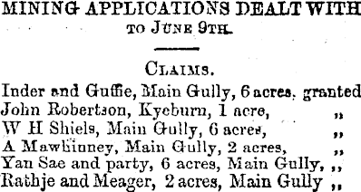 MINING- APPLICATIONS DEALT WITH TO JtJSE 9TH. Claims. Inder and Guffie, Main Gully, 6 acres, granted John Robertson, Eycburn, 1 acre, „ W H Sliiels, Main Gully, G acre*, „ A Mawliinney, Main Gully, 2 acres, „ Yan Sae and party, 6 acres, Main Gully, ~ Rafchje and Meager, 2 acres, Main Gully „