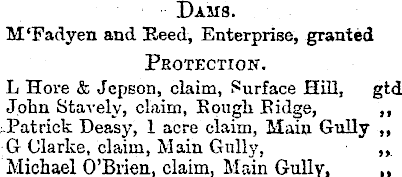 Dam 8. M'Fadyen and Seed, Enterprise, granted Protection. L Hore & Jepson, claim, Surface Hill, gtd John Stavelv, claim, Rough Eidge, ~ Deasy, I acre claim, Main Gully ~ G Clarke, claim, Main Gully, „ Michael O'Brien, claim, Main Gully, ~