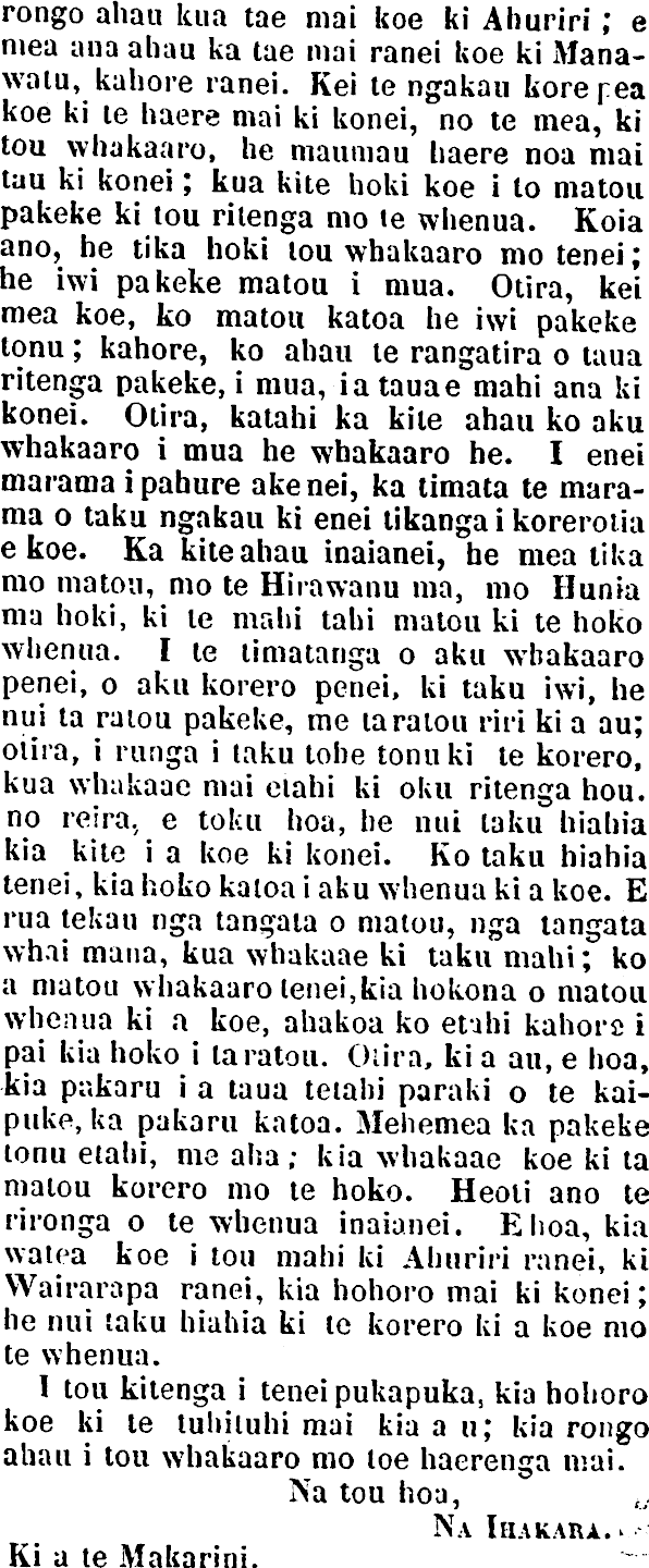 rongo ahau kua tae mai koe ki Ahuriri; e mea ana ahau ka tae mai ranei koe ki Manawaiu, kahore ranei. Kei te ngakau korepea koe ki le haere mai ki konei, no te mea, ki tou vvhakaaro, he maumau haere noa mai tau ki konei; kua kite hoki koe ito matou pakeke ki tou rilenga mo te whenua. Koia ano, he tika hoki tou whakaaro mo tenei; he iwi pakeke matou i mua. Otira, kei mea koe, ko matou katoa he iwi pakeke tonu; kahore, ko ahau te rangatira o taua ritenga pakeke, i mua, iatauae mahi ana ki konei. Otira, katahi ka kite ahau ko aku whakaaro i mua he whakaaro he. I enei marama i pabure akenei, ka timata te marama o taku ngakau ki enei tikanga i koreroiia ekoe. Ka kite ahau inaianei, he mea tika mo matou, mo te Hirawanu ma, mo Hunia ma hoki, ki le mahi tahi matou kite hoko whenua. I te timatanga o aku whakaaro penei, o aku korero penei, ki taku iwi, he nui ta ratou pakeke, me taratou riri ki a au; olira, i runga i taku tohe tonuki te korero, kua whakaae mai elahi ki oku ritenga hou. no reira. e toku hoa, he nui taku hiahia kia kite i a koe ki konei. Ko taku hiahia tenei, kia hoko kaloa i aku whenua ki a koe. E rua tekau nga tangata o malou, nga tangata whai mana, kua whakaae ki taku mahi; ko a matou whakaaro tenei,kia hokona o matou whenua ki a koe, ahakoa ko etahi kahore i pai kia hoko i taratou. Olira, ki a au, e hoa, kia pakaru i a taua teiahi paraki o te kaipuke, ka pakaru katoa. Mehemea ka pakeke lonu etahi, me aha ; kia whakaae koe ki ta matou korero mo te hoko. Heoli ano te rironga o te whenua inaianei. Ehoa, kia watea koe i ton mahi ki Ahuriri ranei, ki Wairarapa ranei, kia hohoro mai ki konei; he nui taku hiahia ki le korero ki a koe mo te whenua. 1 tou kitenga i tenei pukapuka, kia hohoro koe kite tuhiluhi mai kia a u; kia rongo ahau i tou whakaaro mo toe haerenga mai. Na tou hoa, Na Ihakara. >. Ki a te Makarini.