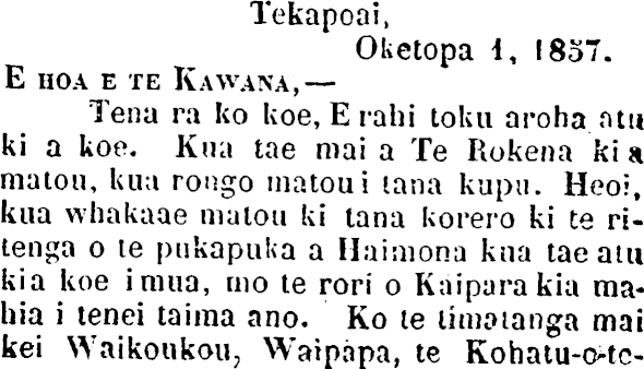 Tekapoai, Oketopa i, 1857. E HOA E TE KAWANA, — Tena ra ko koe, Erahi toku aroha atn ki a koe. Kua tae mai aTe Rokena ki a matou, kua rongo matoui lana kupu. Heoi, kua whakaae malou ki tana korero kite ritenga o te pukapuka a Haimona kna tae am kia koe imua, mo te rori o Kaiparakia mahia i tenei tairaa a no. Ko te limatanga mai kei Waikoukou, Waipapa, te Kohatu-o-tc-