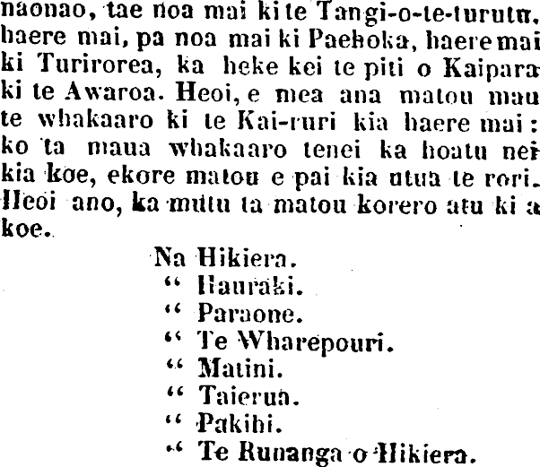 naonao,tae doa mai kite Tangi-o-te-turutn, haere mai, pa noa mai ki Paehoka, haere mai ki Turirorea, ka heke kci te piti o Kaipara kite Awaroa. Heoi, e mea ana matou mau te whakaaro kite Kai-i uri kia haere mai: ko ta maua whakaaro lenei ka hoatu ner kia kde, ekore matou e pai kia atua te rori. Heoi ano, ka nniiu la matou korero atu ki a koe. Na Hikiern. " Itauraki. *' Paraone. •' Te Wharepouri. " Maiini. " Taierua. •' Pakihi. -' Te Runanga o'Hikiera.