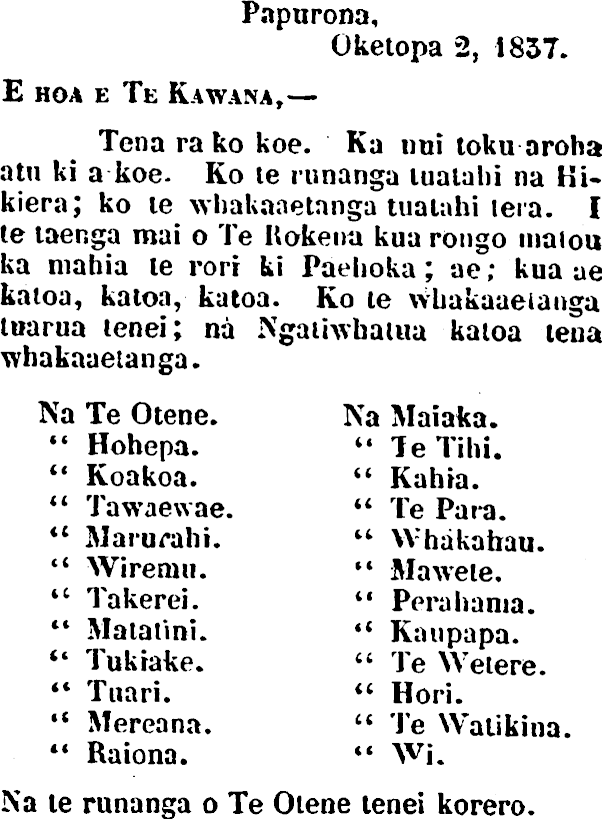 Papurona, Oketopa 2, 1837. E HOA e Te Kawana,— Tcna ra ko koe. Ka iiui toku aroha atu ki a koe- Ko te runanga lualahi na Kikiera; ko te whakaaetnnga tuatahi tera. I te taenga mai o Te Itokeita kua rongo maiou ka niahia le rorr ki Paehoka; ae; kua ae katoa, katoa, katoa. Ko te wuakaaeianga tuarua tenei; na Ngaihvhama katoa lena whakaaetanga. Na Te Otene. Na Maiaka. •• Hohepa. " le Tihi. " Koakoa. " Kahia. " Tawaewae. " Te Para. " Marurahi. " Whakahau. " Wiremti. •• Mawete. tc Takerei. " Perahania. " Maiatini. «« Kaupapa. " Tukiake. " Te Wetere. «« Tuari. " Hori. • c Mereana. " Te Walikina. " Raiona. " Wi. Na te runanga o Te Otene tenei korero.