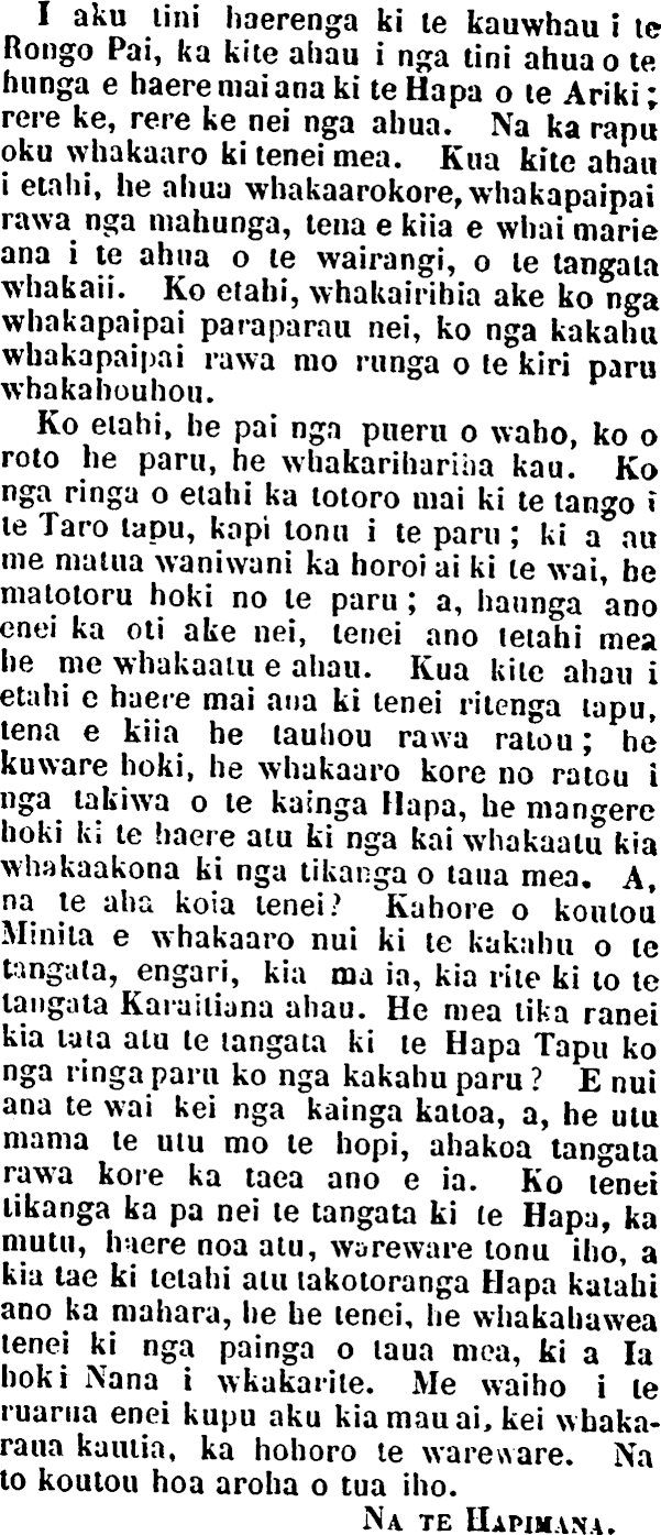 I aku tini haerenga kite kauwhau ite Rongo Pai, ka kite ahau i nga tini ahua o te hunga e haere mai ana kite Hapa ote Ariki; rere ke, rere ke nei nga ahua. Na ka rapu oku whakaaro ki tenei mea. Kua kite ahau i etahi, he ahua whakaarokore, whakapaipai rawa nga mahunga, tena e kiia e wbai marie ana ite ahua ote wairangi, ole tangala whakaii. Ko etahi, whakairibia ake ko nga whakapaipai paraparau nei, ko nga kakahu whakapaipai rawa mo runga ole kiri paru whakahouhou. Ko eiahi, be pai nga ptieru o waho, ko o roto be paru, he wbakarihariha kau. Ko nga ringa o etahi ka totoro mai kite tango 1 le Taro lapu, kapi tonu i te paru ; ki a au me matua waniwani ka horoi ai kite wai, be matotoru hoki no le paru; a, haunga ano enei ka oti ake nei, tenei ano letahi mea he me whakaaiu e ahau. Kua kite ahau i etahi e haere mai ana ki tenei rilenga lapu, tena e kiia he lauhou rawa raiou; he kuware hoki, he whakaaro kore no ratou i nga takiwa ole kainga Hapa, he mangere hoki kite haere aiu ki nga kai whakaaiu kia whakaakona ki nga tikanga o taua mea. A, na te aha koia lenei? Kahore o koulou Minila e whakaaro nui kite kakahu ote tangala, engari, kia ma ia, kia rile ki 10 te langata Karaiiiana ahau. He mea tika ranei kia laia aiu te langata kite Hapa Tapu ko nga ringa paru ko nga kakahu paru ? E nui ana te wai kei nga kainga katoa, a, he ulu mama le utu mo te hopi, ahakoa tangala raw r a kore ka taea ano e ia. Ko tenei likanga ka pa nei te tangata ki le Hapa, ka mutu, huere noa atu, wareware tonu iho, a kia tae ki tetahi aiu takotoranga Hapa kaiahi ano ka mahara, he be lenei, he whakahawea tenei ki nga painga o laua mea, ki a Ia bokr Nana i wkakaiite. Me waiho i le ruarua enei kupu aku kiamauai,kei wbakaraua kautia, ka hohoro te wareware. Na to koutou hoa aroha o tua iho. Na te Hapimana.
