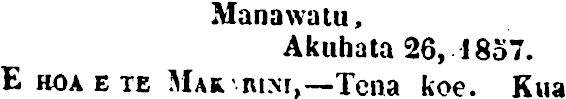 Manawatu, Akuhata26, 1857. E hoaete Mar'rim,—Tena koe. Kua