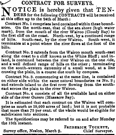 W^" CONTRACT FOR SURVEYS. NOTICE is hereby given that TENDERS for tbe following CONTRACTS will be received at this office up to the 24th of March : Contract No. 1 comprises land contained within these boundaries. On the north-east, that of the sea shore (high water mark), from the mouth of the river Wairoo (Cloudy Bay) to the first cliff on the coast. North-west, by a continued range of hills. South-east, by the river Wairoo. South-west, it terminates at a point where the river flows at the foot of the bills. Contract No. 2 extends from the Wairoo mouth south-east along the coast to a cliff known as the White Bluff ; and inland, is contained between the river Wairoo on the one .<ide, and a well defined range of hills on the other ; terminating on the south-western extremity of a small wood, at a line crossing the plain, in a course due south by compass. Contract No. 3. commencing at the same line, is contained on either side within the same natural boundaries as No. 2 ; and extends inland to the first river flowing from the southeast across the plain to the river Wairoo. Contract No. 4 consists of all the available land on either side of the river Ourere (Massacre Bay). It is estimated that each contract on the Wairoo will comprise as much as 20,000 acres of land ; but it is not probable that more than 75 per cent, of the whole would be eligible for subdivision into sections. The Specifications may be referred to on and after Monday the 1 3th instant. Frederick Tuckett, Survey office, Neslon, March Q. Chief Surveyor.