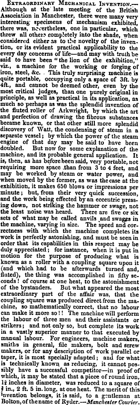 Extraordinary Mechanical Invention.— Although at the late meeting of the British Association in Manchester, there were many very interesting- specimens of mechanism exhibited, there was, nevertheless, one in particular, which threw all other? completely into the shade, when considered either as to the novelty of the invention, or its evident practical applicability to the every day concerns of life — and may with truth be said to have been " the lion of the exhibition," viz., a machine for the working or forging of iron, steel, &c. . This truly surprising machine is quite portable, occupying only a space of 3ft. by 4ft., and cannot be deemed other, even by the most critical judges, than one purely original in principle, as well as practical in its application, as much so perhaps as was the splendid invention of the fluted roller of Arkwright, by which the art and perfection of drawing the fibrous substances became known, or that other still more splendid discovery of Watt, the condensing of steam in a separate vessel ; by which the power of the steam engine of that day may be said to' have been doubled. But now for some explanation of the machine, and its probable general application. It is, then, as has before been said, very portable, not requiring more space .than from 3 to 4 feet, and may be worked by steam or water power, and when moved by the former, as was the case at the exhibition, it makes 650 blows or impressions per minute ; but, from their very quick succession, and the work being effected by an eccentric pressing down, not striking the hammer or swage, not the least noise was heard. There are five or six sets of what may be called anvils ,and swages in the machine, varying in size. The speed and correctness with which the machine completes its work is perfectly astonishing, and must be seen in order that its capabilities in this respect may be duly appreciated ; for instance, when it is put in motion for the purpose of producing what is known as a roller with a coupling square upon it (and which had to be afterwards turned and, fluted), the thing was accomplished in fifty seconds ! of course at one heat, to the astonishment of the bystanders. But what appeared the most extraordinary part of the affair was, that the coupling square was produced direct from the machine, so mathematically correct, that no labour can make it more so ! ! The machine will perform the labour of three men and their assistants or strikers ; and not only so, but complete its work in a vastly superior manner to that executed by manual labour. For engineers, machine makers, smiths in general, file makers, bolt and screw makers, or for any description of work parallel or taper, it is most specially adapted ; and for what is technically known as reducing, it cannot possibly have a successful competitor — in proof of which, it may be stated that a piece of round iron, IS inches in diameter, was reduced to a square of 3 in., 2 ft. 5 in. long, at one heat. The merit of this J nvention belongs, it is said, to a gentleman at Bolton,of thename of Ryder. — Mancheiter Courier.