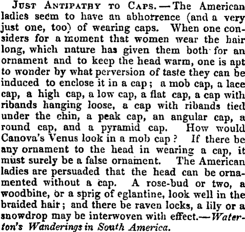 Just Antipathy to Caps. — The American ladies seem to have an abhorrence (and a very just one, too) of wearing caps. When one considers for a moment that women wear the hair long, which nature has given them both- for an ornament and to keep the head warm, one is apt to wonder by what perversion of taste they can be induced to enclose it in a cap ; a mob cap, a lace cap, a high cap, a low cap, a flat cap, a cap with ribands hanging loose, a cap with ribands tied under the chin, a peak cap, an angular cap, a round cap, and a pyramid cap. How would Caaova's Venus look in a mob cap ? If there be any ornament to the head in wearing a cap, it must surely be a false ornament. The American ladies are persuaded that the head can be ornamented without a cap. A rose-bud or two, a woodbine, or a sprig of eglantine, look well in the braided hair ; and there be raven locks, a lily or a snowdrop may be interwoven witli effect. — Waterton's Wanderings in South America.