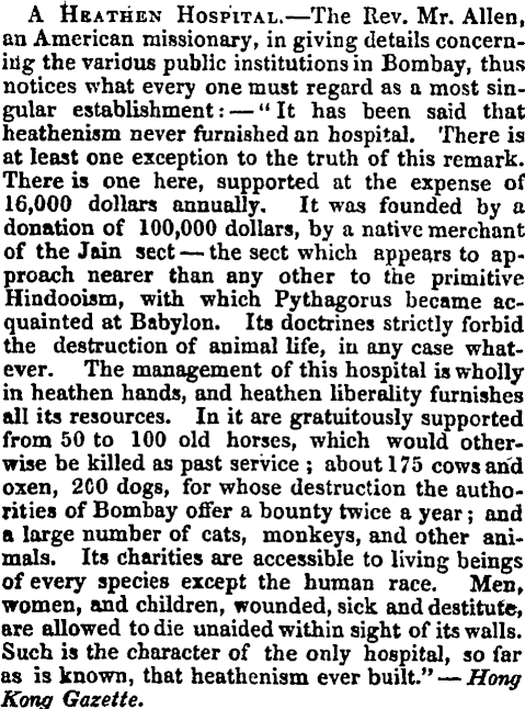 A Heathen Hospital. — The Rev. Mr. Allen, an American missionary, in giving details concerning the various public institutions in Bombay, thus notices what every one must regard as a most singular establishment: — "It has been said that heathenism never furnished an hospital. There is at least one exception to the truth of this remark. There is one here, supported at the expense of 16,000 dollars annually. It was founded by a donation of 100,000 dollars, by a native merchant of the Jain sect — the sect which appears to approach nearer than any other to the primitive Hindooism, with which Pythagorus became acquainted at Babylon. Its doctrines strictly forbid the destruction of animal life, in any case whatever. The management of this hospital is wholly in heathen hands, and heathen liberality furnishes all its resources. In it are gratuitously supported from 50 to 100 old horses, which would otherwise be killed as past service ; about 175 cows and oxen, 2GO dogs, for whose destruction the authorities of Bombay offer a bounty twice a year ; and a large number of cats, monkeys, and other animals. Its charities are accessible to living beings of every species except the human race. Men, women, and children, wounded, sick and destitute, are allowed to die unaided within sight of its walls. Such is the character of the only hospital, so far as is known, that heathenism ever built." — Hong Kong Gazette.