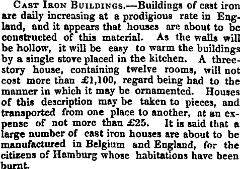 Cast Ikon Buildings. — Buildings of cast iron are daily increasing at a prodigious rate in England, and it appears that houses are about to be constructed of this material. As the walls will be hollow, it will be easy to warm the buildings by a single stove placed in the kitchen. A threestory house, containing twelve rooms, will not cost more than .£l,lOO, regard being had to the manner in which it may be ornamented. Houses of this description may be taken to pieces, and transported from one place to another, at an expense of not more than £25. It is said that a large number of cast iron houses are about to be manufactured in Belgium and England, for the citizens of Hamburg whose habitations have been burnt