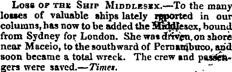 Loss of the Ship Middlesex. — To the many losses of valuable ships lately imported in our columns, has now to be added the Middlesex, bound from Sydney for London. She wat drtv]pn,on shore near Maceio, to the southward of Pernuqbuco, and soon became a total wreck. The crew and pasiJefcgers were saved. — Time*.