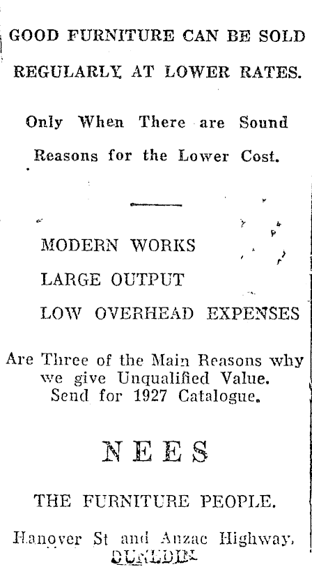 GOOD FURNITURE CAN BE SOLD REGULARLY AT LOWER RATES. Only When There are Sound Reasons for the Lower Cost. r MODERN WORKS . ? > ' r LARGE OUTPUT LOW OVERHEAD EXPENSES Are Three of the Main Reasons why we give Unqualified Value. Send for 1927 Catalogue. NEE S THE FURNITUP.E PEOPLE. Hanover St and Anzac Highway,