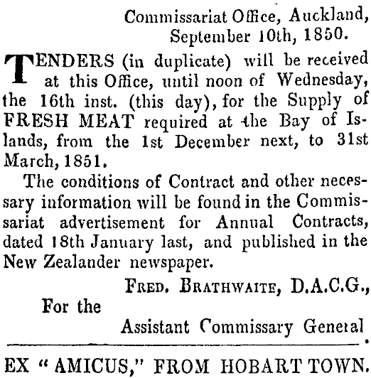 Commissariat Office, Auckland, September 10th, 1850. TENDERS (in duplicate) will be received at this Office, until noon of Wednesday, the 16th inst. (this day), for the Supply of FRESH MEAT required at 4he Bay of Islands, from the Ist December next, to 31st March, 1851. The conditions of Contract and other necessary information will be found in the Commissariat advertisement for Annual Contracts, dated 1 8th January last, and published in the New Zealander newspaper. Fred. Brathwaite, D.A.C.G.i For the Assistant Commissary General EX " AMICUS," FROM HOBART TOWN.