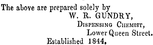 The above are prepared solely by W. R. GUNDRY, Dispensing Chemist, Lower Queen Street. Established 1844.