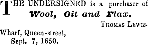 f|'HE UNDERSIGNED is a purchaser of ■*• "Wools Oil and Flax. Thomas Lewis. Wharf, Queen -street, Sept. 7, 1850.