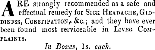 ARE strongly recommended as a safe and effectual remedy for Sick Headache, Giddinfss, Constipation^ &c; and they have ever been found most serviceable in Liver Complaints. In Boxes, Is. each.