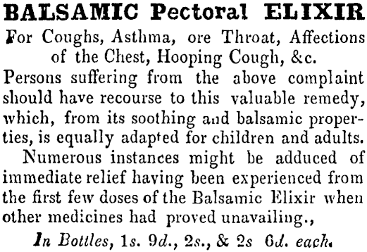 BALSAMIC Pectoral ELIXIR For Coughs, Asthma, ore Throat, Affections of the Chest, Hooping Cough, &c. Persons suffering from the above complaint should have recourse to this valuable remedy, which, from its soothing and balsamic properties, is equally adapted for children and adults. Numerous instances might be adduced of immediate relief having been experienced from the first few doses of the Balsamic Elixir when other medicines had proved unavailing., In Bottles, Is. 9d., 25., & 2s QJ. each*