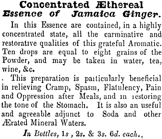 Concentrated JEthereal Essence of Jamaica Ginger. In this Essence are contained, in a highly concentrated state, all the carminative and restorative qualities of this grateful Aromatic. Ten drops are equal to eight grains of the Powder, and may be taken in water, tea, wine, &c. . This preparation is paiticularly beneficial in relieving Cramp, Spasm, Flatulency, Pain and Oppression after Meals, and in lestoring the tone of the Stomach. It is also an useful and agreeable adjunct to Soda and other iErated Mineral Waters. In Bottles, Is , 2s. & 3s. 6d. each..