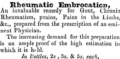 Rheumatic Embrocation, An invaluable remedy for Gout, Chronio Rheumatism, prams, Pains in the Limbs, &c, prepared from the prescription of an eminent Physician. The increasing demand for this preparation is an ample proof of the high estimation in which it is held. In Bottles, 2s , 3s. & ss. each.
