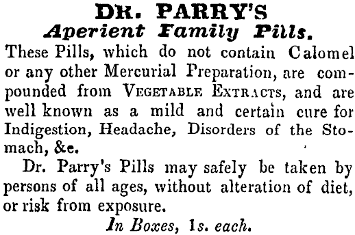DH. PARRY'S Aperient Family Fills. These Pills, which do not contain Calomel or any other Mercurial Preparation, are compounded from Vegetable Extracts, and are well known as a mild and certain cure for Indigestion, Headache, Disorders of the Stomach, &c. Dr. Parry's Pills may safely be taken by persons of all ages, without alteration of diet, or risk from exposure. In Boxes, Is. each.