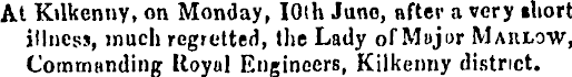 At Kilkenny, on Monday, lOlh Juno, after a very iliort illness, much regretted, the Lady of Major Maklow, Commanding Royal Engineers, Kilkenny district.