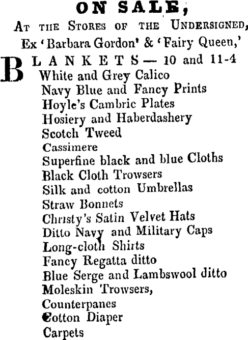 ON SALE, At the Stores of the Undersigned, Ex 'Barbara Gordon 1 & 'Fairy Queen,' BL A N X E T S— 10 and U-4 White and Grey Calico Navy Blue and Fancy Prints Hoylc's Cambric Plates Hosiery and Haberdashery Scotch Tweed Cassimere Superfine black and blue Cloths Black Cloth Trowsers Silk and cotton Umbrellas Straw Bonnets Christy's Satin Velvet Hats Ditto Navy and Military Caps Long-cloth Shirts Fancy Regatta ditto Blue Serge and Lambswool ditto Moleskin Trowsers, Counterpanes €?otton Diaper Carpets