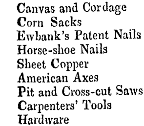 Canvas and Cordage Corn Sacks Ewbank's Patent Nails Horse -shoe Nails Sheet Copper American Axes Pit and Cross-cut Saws Carpenters' Tools Hardware
