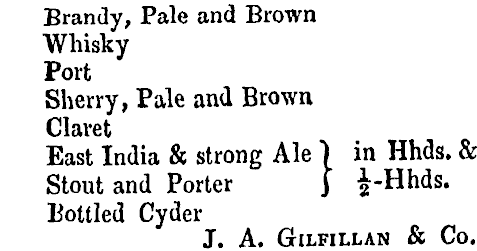 Brandy, Pale and Brown Whisky Port Sherry, Pale and Brown Clavet East India & strong Ale ) in Hhds. & Stout and Porter J £-Hhds. Bottled Cyder J. A. GILFILLAN & Co.