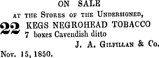 ON SALE at the Stores of the Undersigned, OO KEGS NEGROHEAD TOBACCO boxes Cavendish ditto J, A. GILFILLAN & Co. Nov. 15,1850.