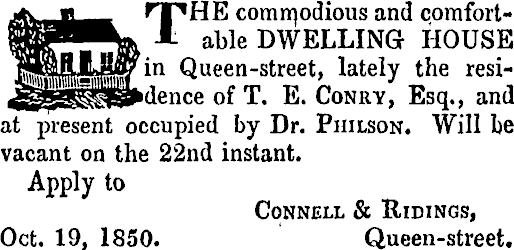 rr*HE commodious and comfortI|P™^ Mi a bk DWELLING HOUSE Jggjy||7in Queen-street, lately the resijjgßpgglllafcdence of T. E. Conry, Esq., and at present occupied by Dr. Philson. Will be vacant on the 22nd instant. Apply to Connell & Ridings, Oct. 19, 1850. Queen-street.